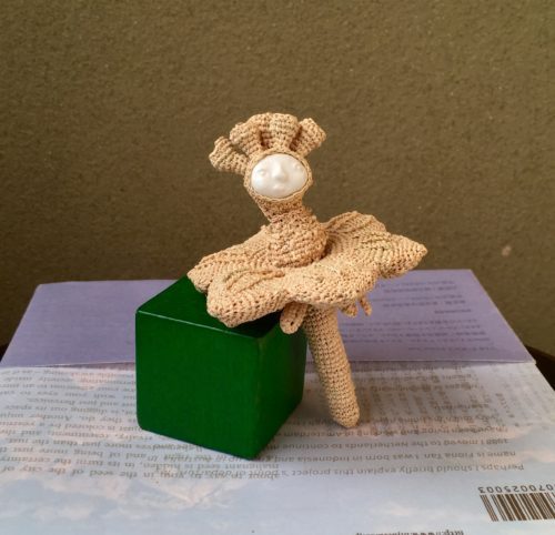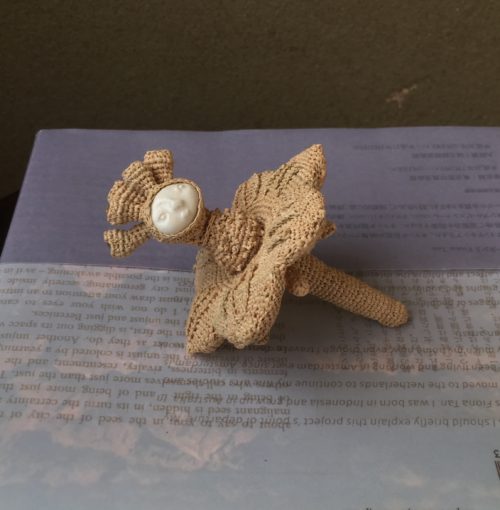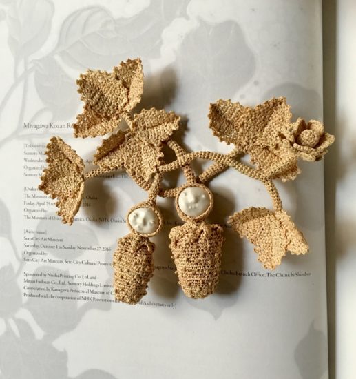 いずみ「一輪の花にこだわって作ったの。水晶を5粒を頭の上につけて華やかに。深みも出ていい感じ。でも、そうしたら重心が上に集まって、予想外に困ってしまった。平面にラフィア編みの一輪の花を置くと、頭の方が重くて、ひっくり返って頭が下になってしまう。だからもう一度始めから作り直し」