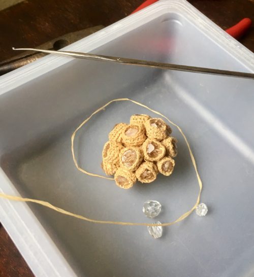 球面に出来るだけたくさんラフィア編みで、水晶をくっ付けるのは予想よりも難しい。細いかぎ針の先が曲がってきました。水晶を16粒ちりばめました。あともうちょっとです。しだいに重さも増え、ここまで出来た重みです。