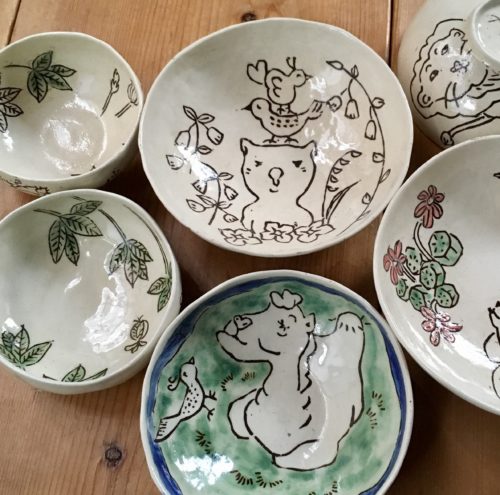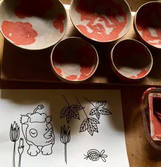 アップリケ刺繍のためにたくさん絵を描きました、それで陶芸の器にも絵をつけてみました。象嵌という技法です。まだ柔らかい陶土に線彫りして絵を描いて、そこに違う色の粘土を塗って埋めこみます。最近絵を描いたところで、まだ体が絵を覚えているので、下書きなしに思うままに絵を彫りました。