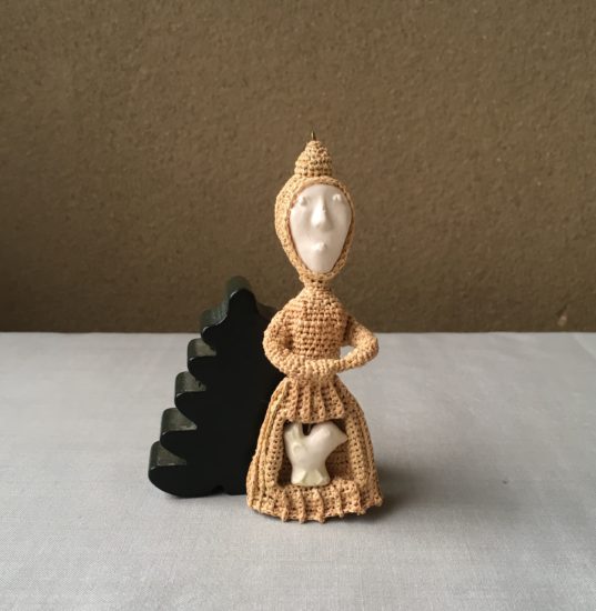 顔とトリはオリジナルの白磁です、体はラフィア編みで作りました。身体は10cm、体重14g。最初のアイデアより、出来上がりがよくなって、嬉しいです。こんなことは滅多にありません。