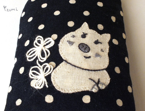 水玉柄の綿麻布地でメガネケースを作りました。イノブタは、綿麻生地のアップリケ刺繍で、お花は、麻コード刺繍です。中綿が入っていてクッションになっています。メガネケースとして、また大切なものを入れるポーチとして活躍します。