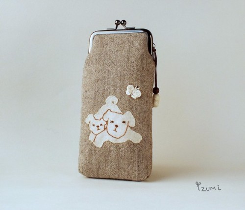 眠い子犬と蝶のアップリケ刺繍のメガネケース