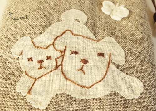 フェルト地にアップリケ刺繍は、手間がかかります。毛足の長い柔らかいフェルト地と繊維の整ったアップリケ生地の組み合わせは、予想以上に難しいもの。アップリケの張りを保ちながら、表情豊かに刺繍を入れる工程。ケータイケースの仲間たちを増やしたくて頑張りました。