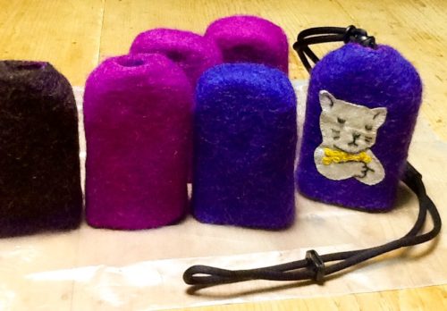 釣鐘形の羊毛フェルトで作った大きなペンダントみたいなケータイケースネックストラップに新しい仲間たちを増やしました。羊毛の色はバイオレットとマリンブルーと少し冒険をして新色のランプブラックです。