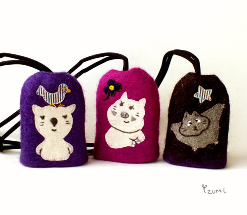 首にストラップをかけて、釣鐘型の羊毛フェルトのケータイケースから、ケータイを取り出して使います。ネックストラップとケータイケースが一体となっているので、ケータイケースを失うこともなく、自然とケータイにケースとして戻ります。バイオレットの羊毛フェルトにウオンバットとトリのアップリケ刺繍です。羊毛フェルトは摩擦や水に濡れると多少縮やすいので、少し余裕のある大きさに作りました。使い込むほどに、中身のケータイの形に羊毛フェルトは変化していきます。